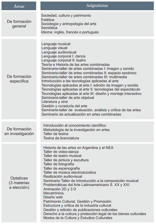 En estos procesos se han establecido diálogos entre las diferentes disciplinas tradicionales como la literatura, la pintura, el dibujo, la escultura, la música, el teatro, la danza, la fotografía y el cine. De esos entrecruzamientos de lenguajes específicos se han constituido categorías y prácticas transversales a los mismos, estableciéndose múltiples modalidades de intercambio entre esas disciplinas, que articulan una fuerte fundamentación teórica y una práctica intensiva. Es a partir de ello, y respondiendo a áreas de vacancia en la formación y ejercicio profesional de la región que se propone la formación de grado a través de la Licenciatura en Artes Combinadas. Esta licenciatura brinda un campo de experimentación continuo para la producción artística y la investigación que ya no reconoce los límites entre el cuerpo, el sonido, la imagen, la acción, la palabra.