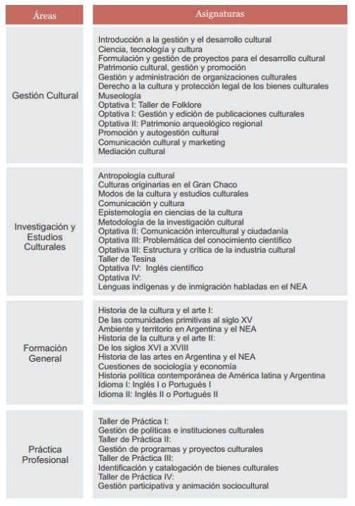 En Argentina, y específicamente en el NEA, existen numerosas y variadas acciones orientadas a cubrir necesidades de desarrollo social y cultural de la región, originadas en el Estado, la sociedad civil y el mercado. Los licenciados en Gestión y Desarrollo Cultural, y asimismo los técnicos, podrán encontrar como ámbitos de inserción laboral museos, sitios históricos y arqueológicos, centros culturales, artísticos y artesanales, salas e institutos de estudio de actividades artísticas y audiovisuales, fundaciones y asociaciones civiles vinculadas con la promoción del arte, la cultura y el ambiente, dependencias y áreas de la cultura del sector público, centros de investigación, universidades y empresas o entidades privadas que promueven la cultura.