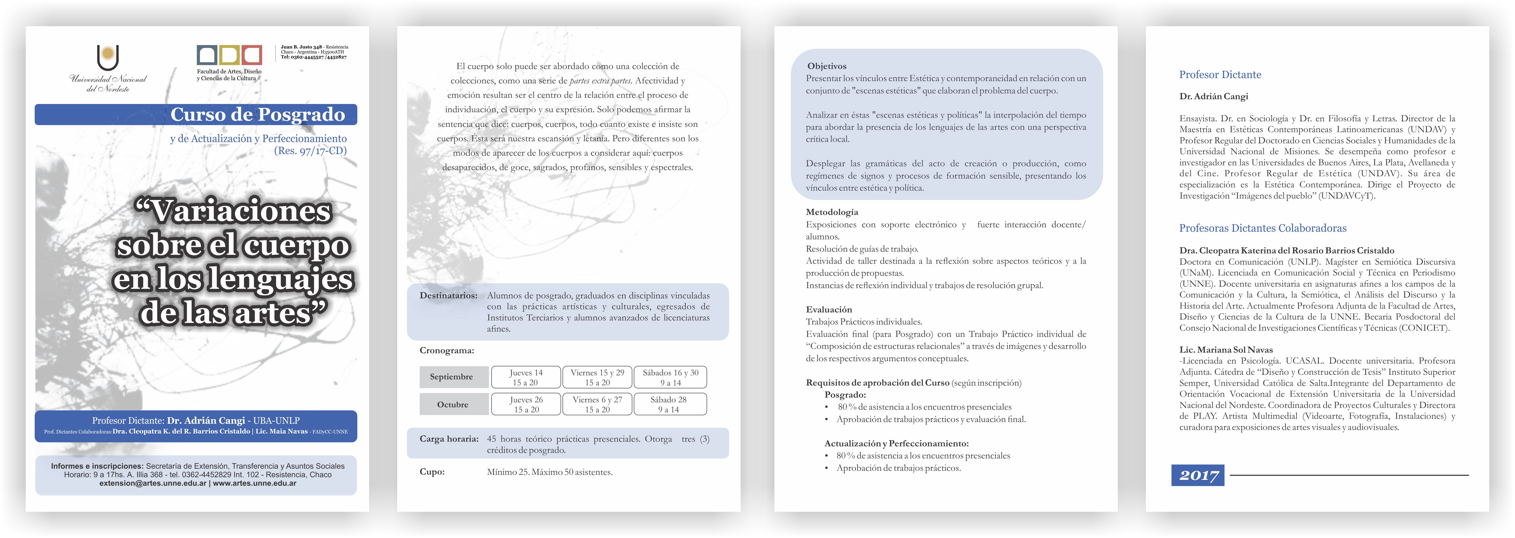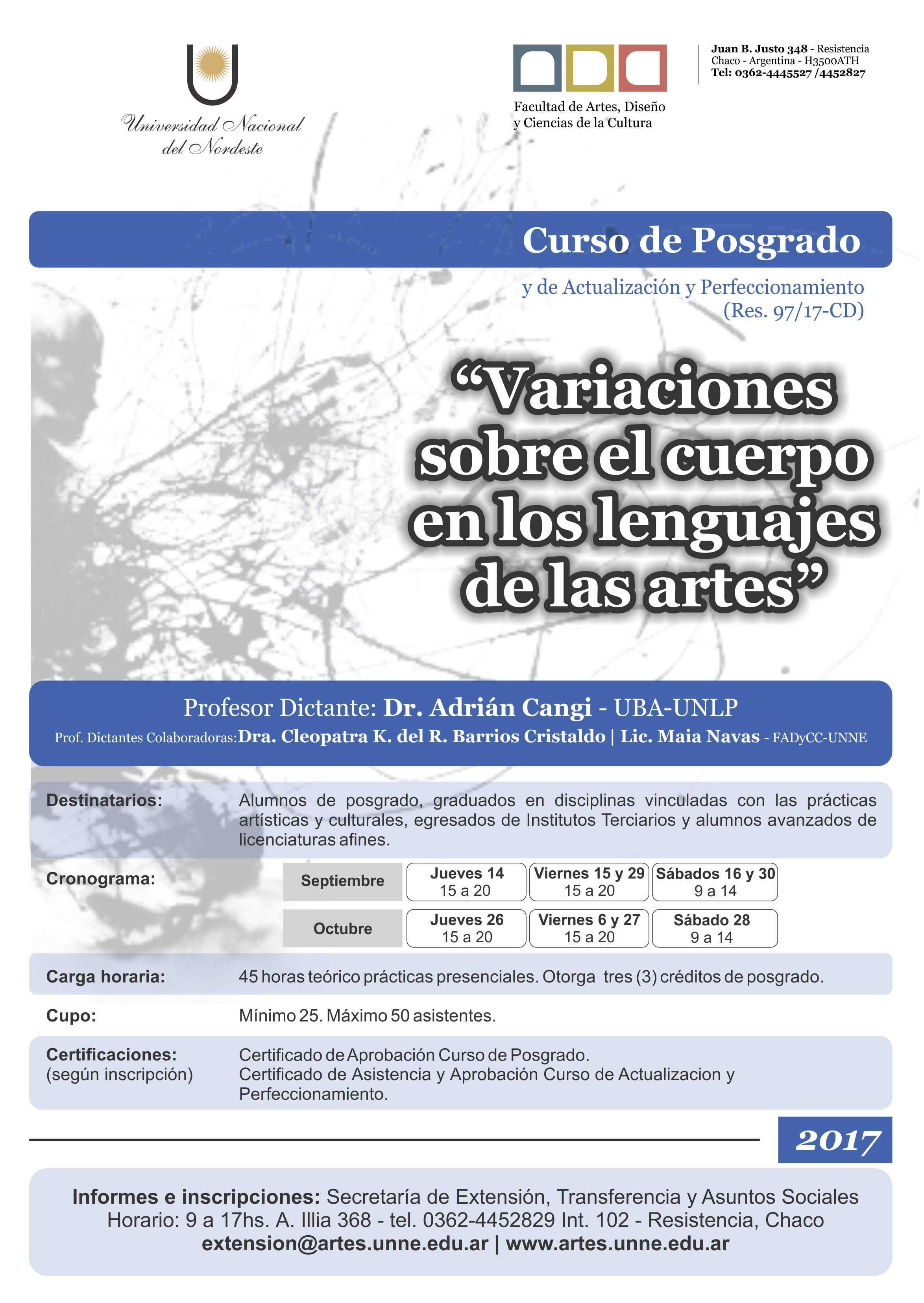 El Dr. Adrian Cangi (UBA-UNLP) dictó el curso "Variaciones sobre el cuerpo en los lenguajes de las artes". Comenzó el 14 de septiembre con 9 encuentros (45 hs.) hasta el 28 de octubre y otorgó 3 créditos de posgrado. Se desempeñaron como profesoras dictantes colaboradoras la Dra. Cleopatra Barrios y la Lic. Mariana Navas (FADyCC-UNNE). Se ofreció con la modalidad de Posgrado para graduados y como Actualización y Perfeccionamiento, para otros interesados.