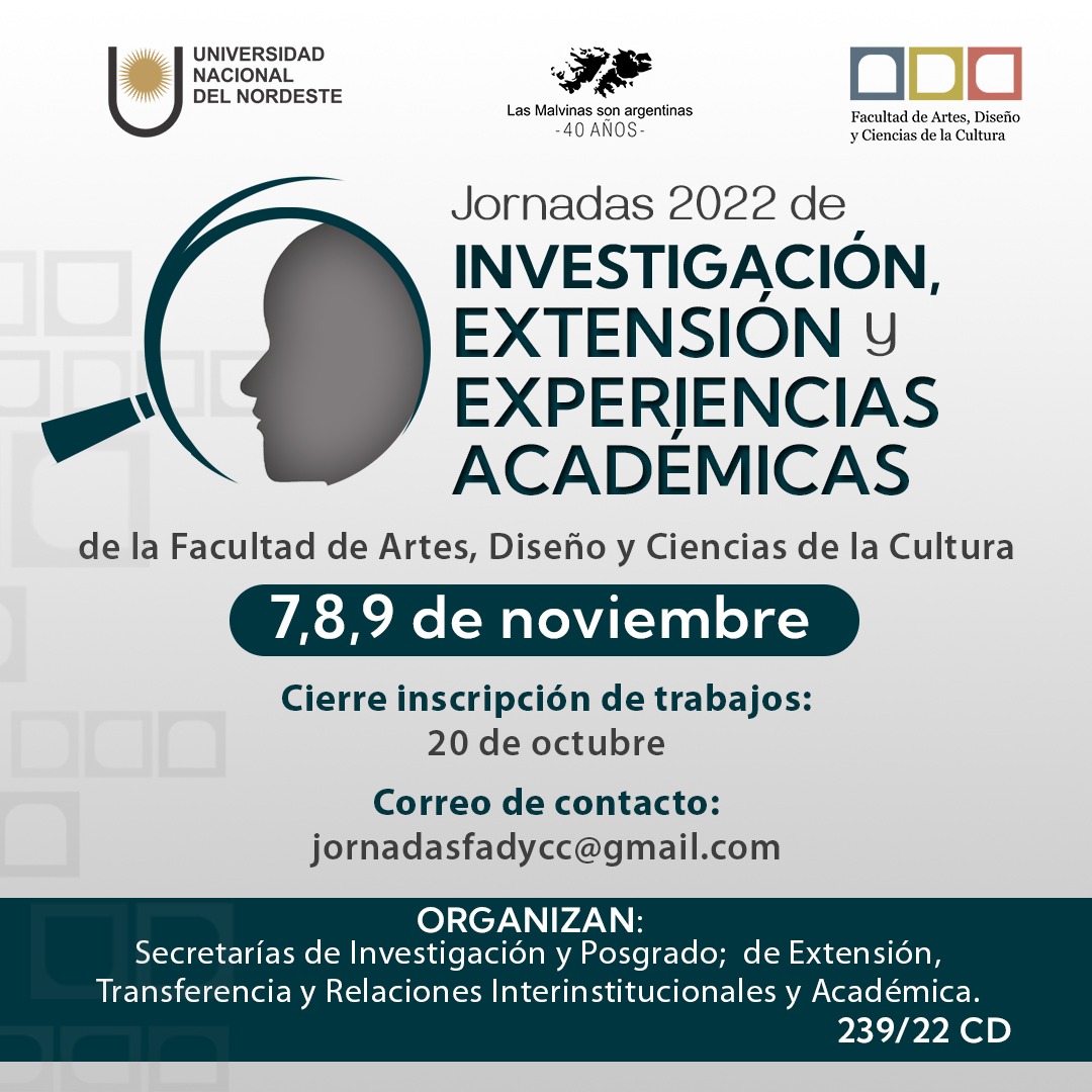 Destinado a Licenciados/as en arte; Licenciados/as en gestión y/o desarrollo cultural; Docentes e investigadores/as de las carreras vinculadas a las artes y a las ciencias de la cultura. Se dictará durante el mes de noviembre los días: Jueves y viernes 21,22,28 y 29, de 15 a 20, y los sábados 23 y 30 de 9 a 14, en la FADyCC Anexo I, calle Illia 368, Resistencia, Chaco, Argentina.