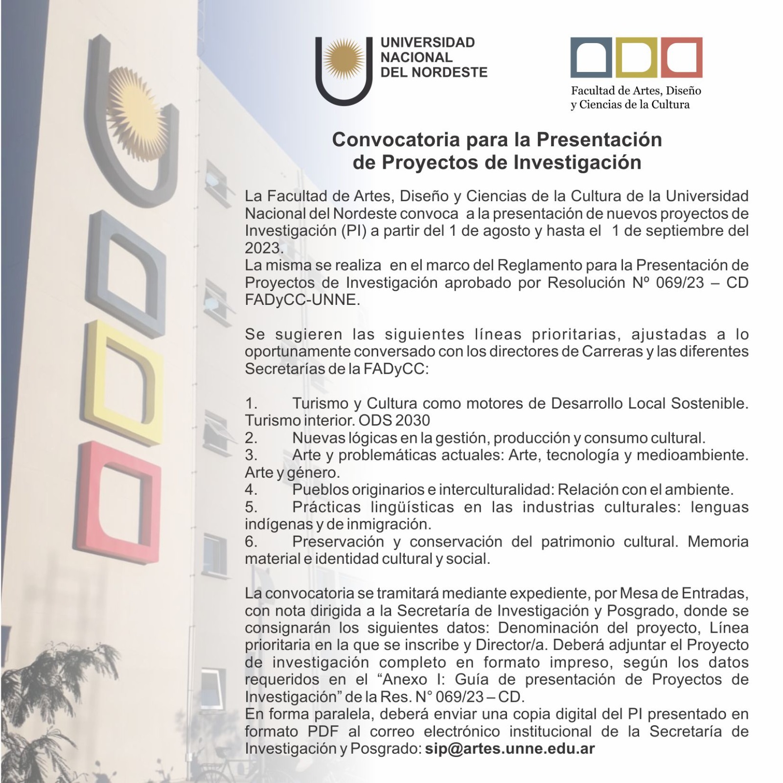 Informes, requisitos e inscripción en Secretaria de Investigación y Posgrado, Colón 188 Resistencia, Chaco, teléfonos (54) 362 4445527-4452827 int. 126 de 8 a 13. Mail: sip@artes.unne.edu.ar
